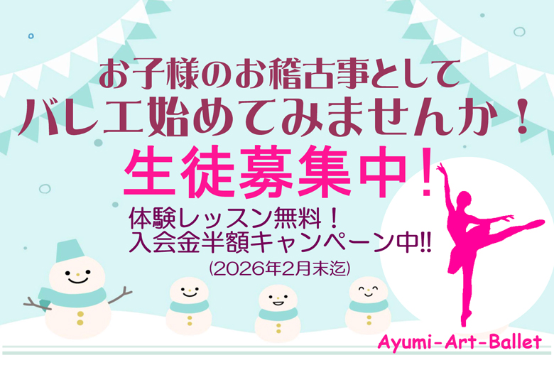 Ayumi Art Ballet(アユミアートバレエ)は、世田谷区三軒茶屋・川崎市武蔵新城・川崎市久地にあるバレエスタジオです。「幼児から大人、親子で楽しむバレエ教室」を基本理念としており、親子バレエ(1歳半~)、幼稚園、小学生、中学生以上、大人の方まで年齢に応じた幅広いクラスをご用意しています。
